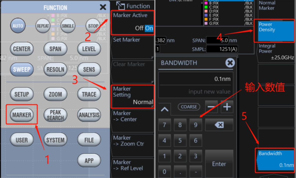 積分功率標(biāo)記是以波形上的標(biāo)記位置為中心,把指定頻率范圍的積分功率值顯示到數(shù)據(jù)區(qū)域的一項(xiàng)功能。在使用者調(diào)制光的光譜計(jì)算信號(hào)功率的情況下,可用此功能計(jì)算擴(kuò)散光譜的積分功率。
