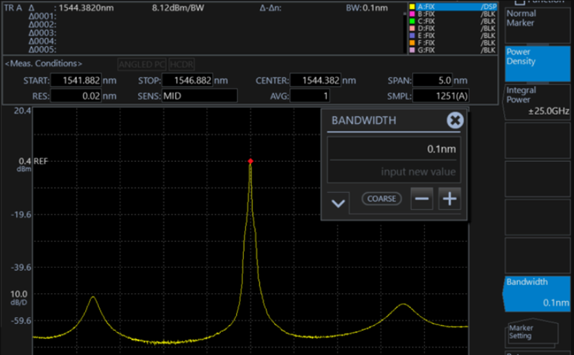 功率譜密度標(biāo)記是以波形上的標(biāo)記位置為中心,把每個(gè)在0.1nm ~ 10.0nm歸一化帶寬設(shè)置范圍內(nèi)的功率值顯示到數(shù)據(jù)區(qū)域的一項(xiàng)功能。測(cè)量信號(hào)噪聲功率的情況下,使用者便可采用這些標(biāo)記計(jì)算出每個(gè)既定帶寬所對(duì)應(yīng)的功率值。