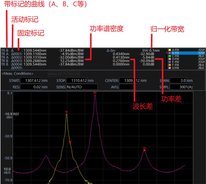 ▲光譜儀同時(shí)在多條曲線上設(shè)置多個(gè)功率譜密度標(biāo)記的示意圖